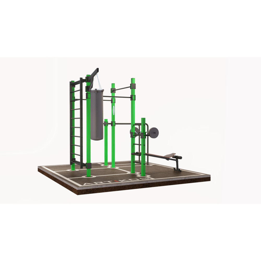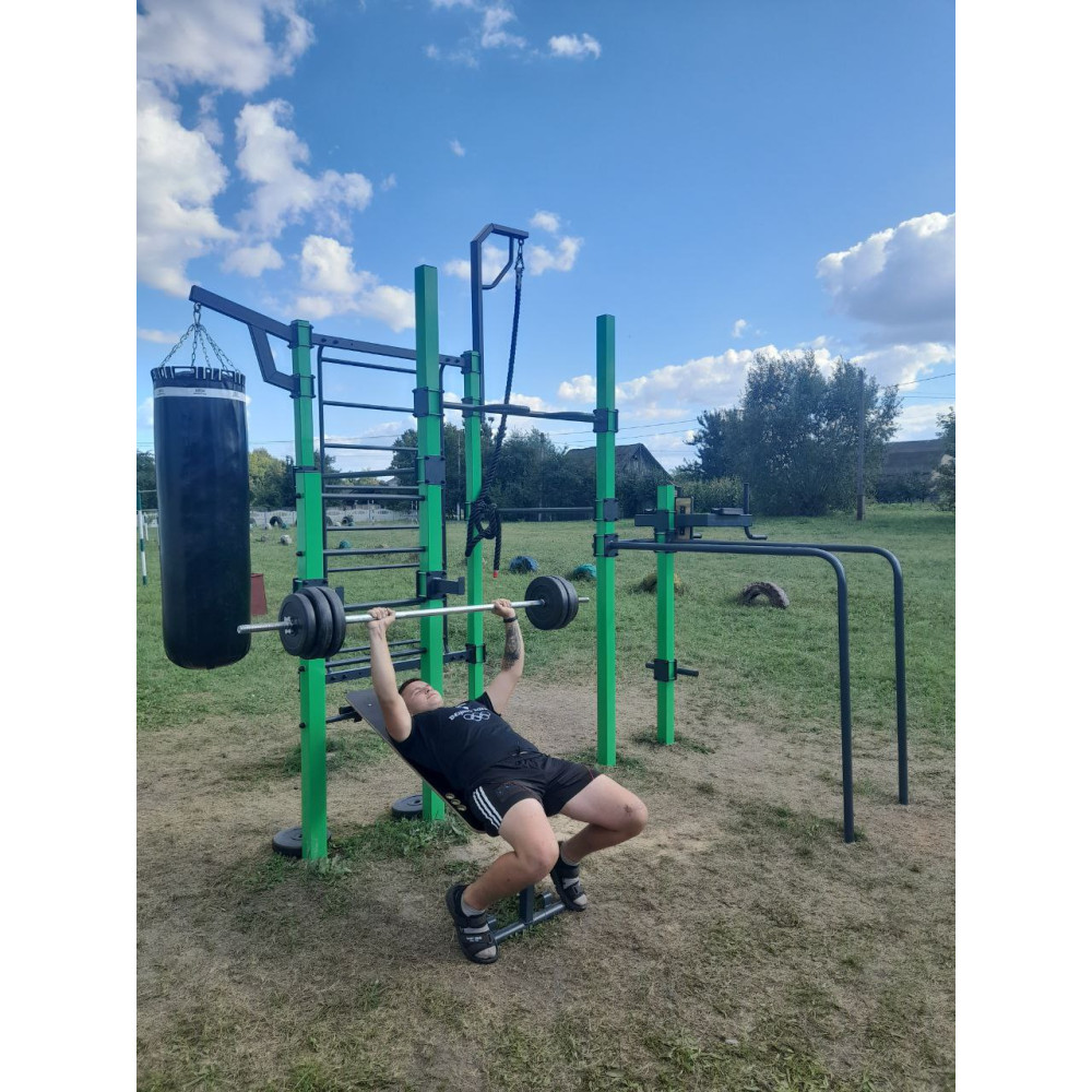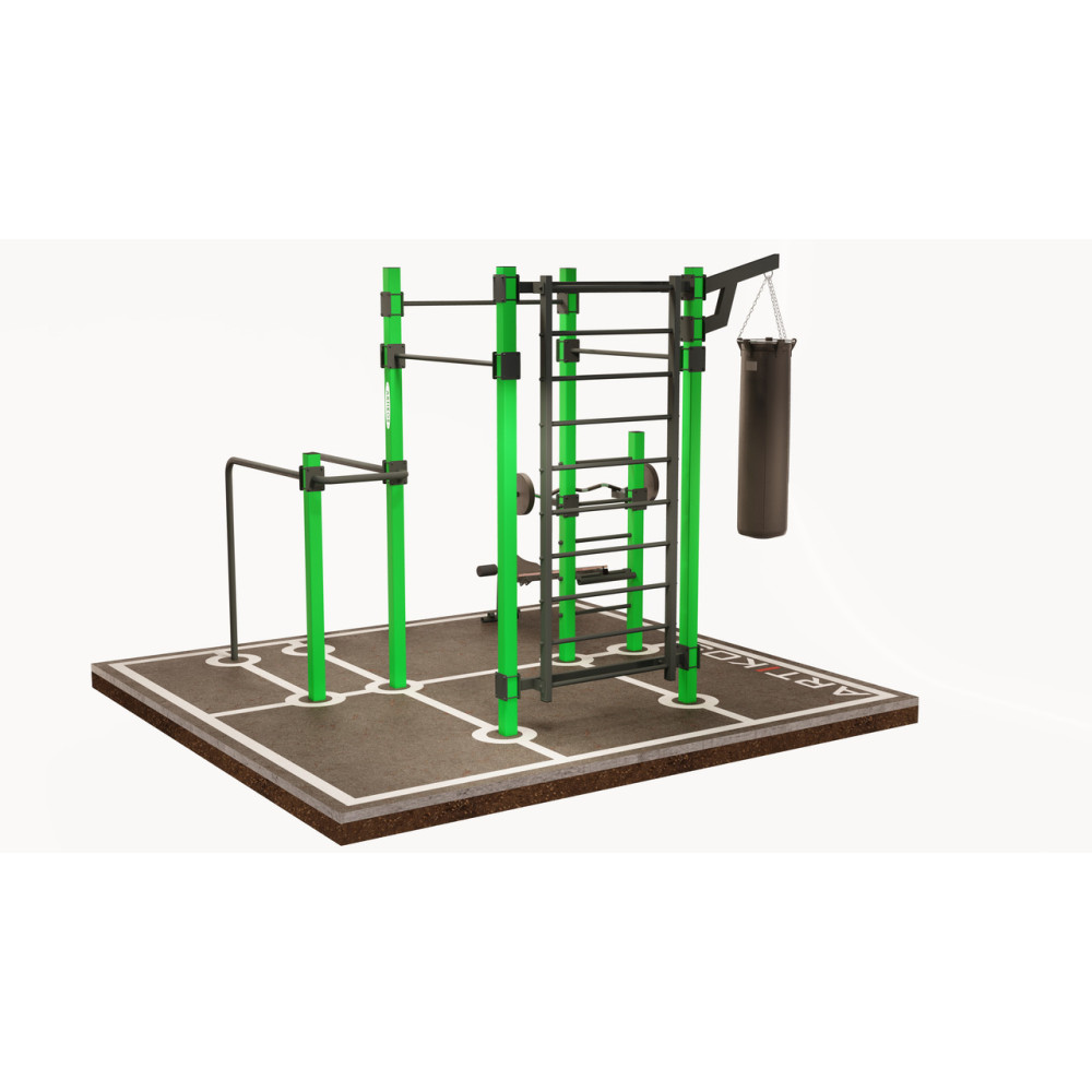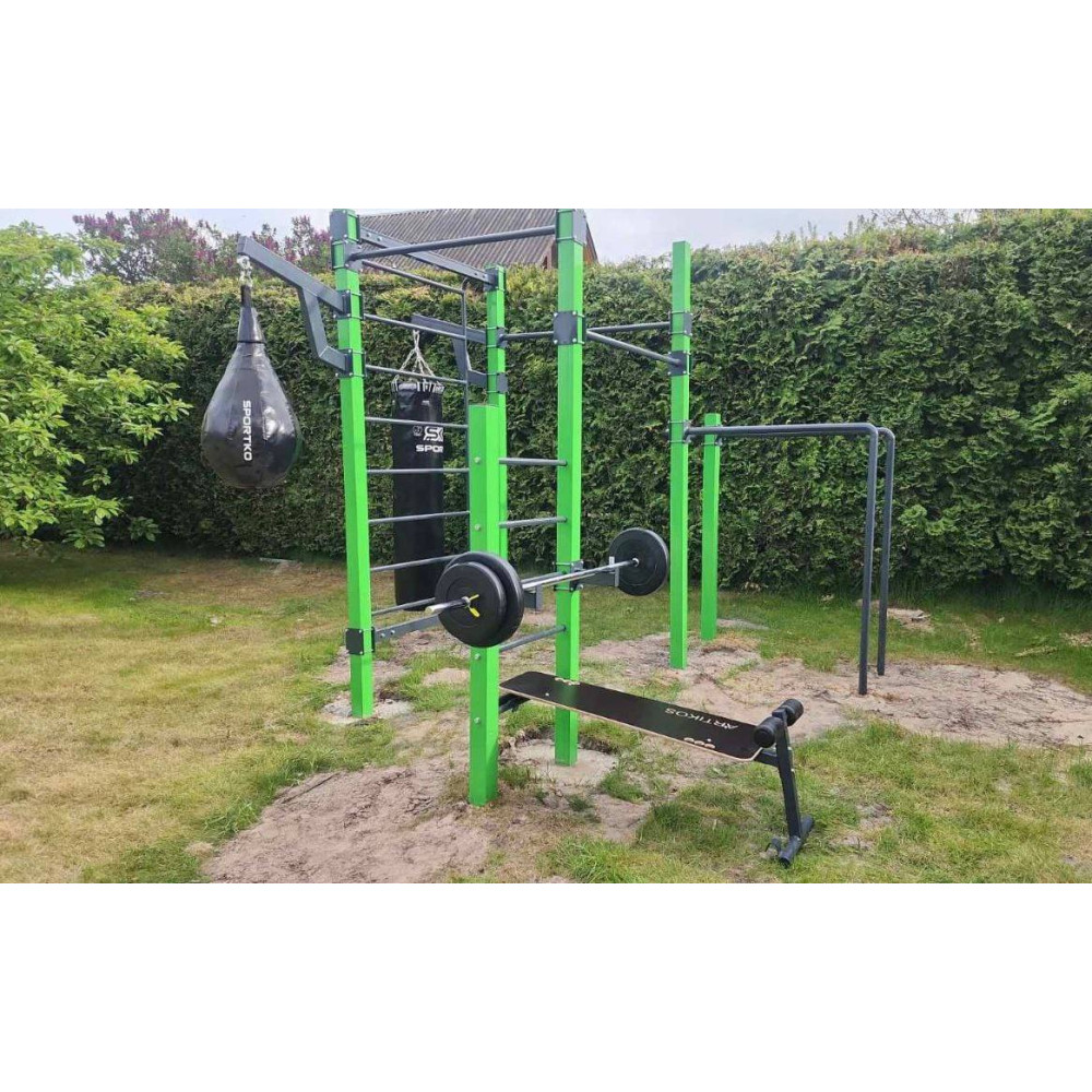 - Maksymalny zestaw: Zawiera drabinkę, drążek poziomy, drążki równoległe, huśtawkę, poręcz, linę, tablicę do koszykówki, ławkę z mocowaniem sztangi i siatkę gladiatora.