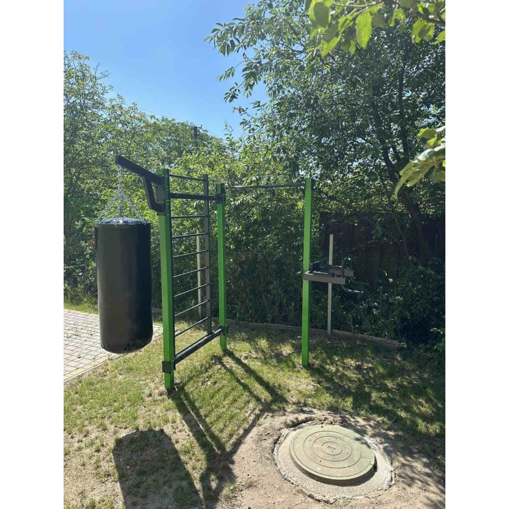 • Maksymalny zestaw: Zawiera drabinkę, drążek poziomy, drążki równoległe, huśtawkę, poręcz, linę, tablicę do koszykówki, ławkę z mocowaniem sztangi i siatkę gladiatora.