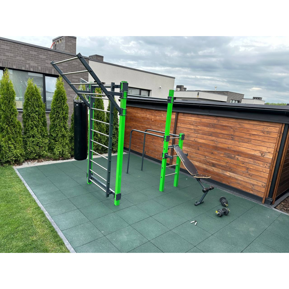• Maksymalny zestaw: Zawiera drabinkę, drążek poziomy, drążki równoległe, huśtawkę, poręcz, linę, tablicę do koszykówki, ławkę z mocowaniem sztangi i siatkę gladiatora.
