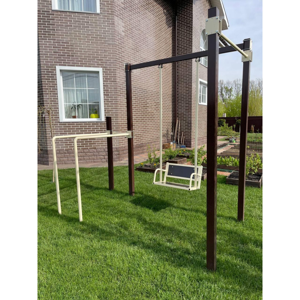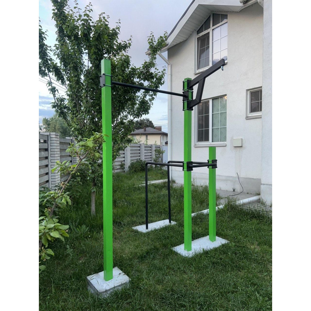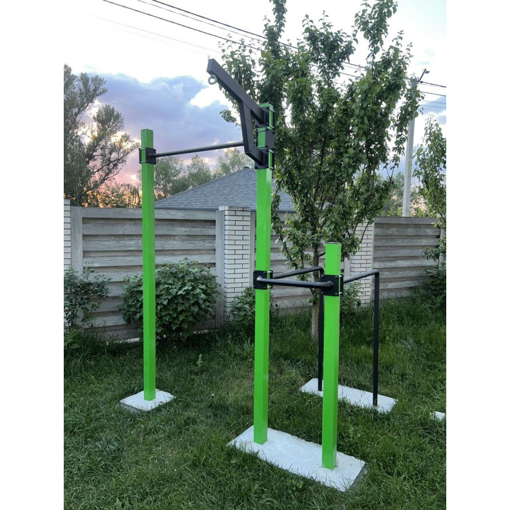 - Maksymalny zestaw: Zawiera drążek poziomy, drążki równoległe, wiązania gruszkowe, linę, tablicę do koszykówki i kramę z mocowaniem sztangi.