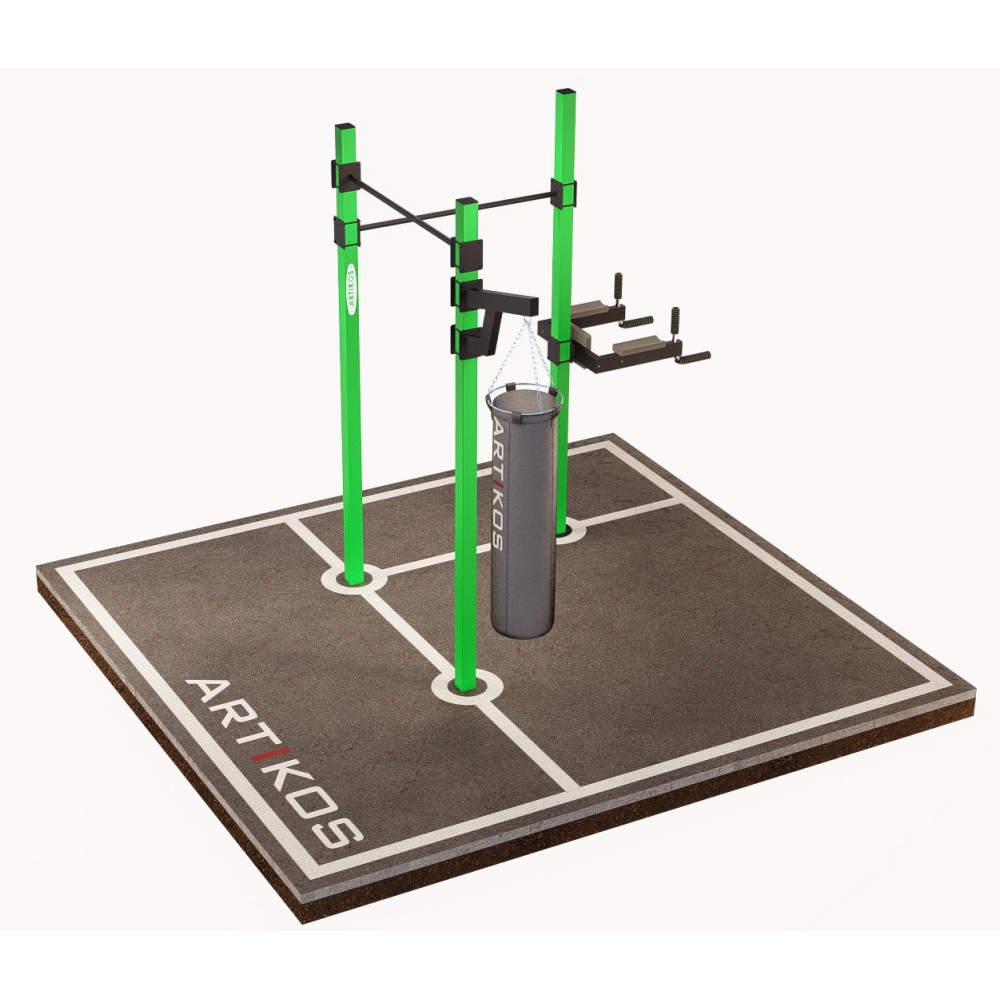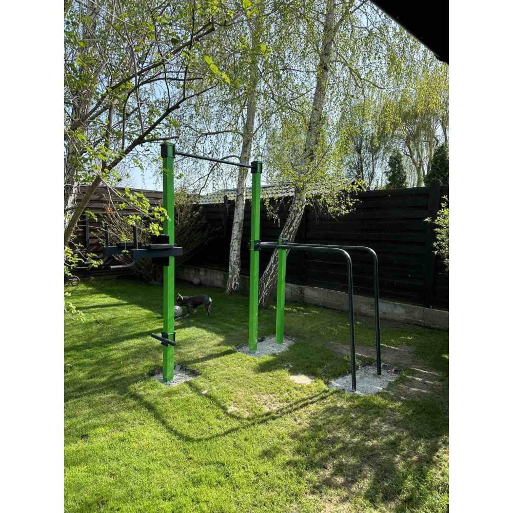 - Maksymalny zestaw: Zawiera drążek poziomy, drążki równoległe, wiązania gruszkowe, linę, tablicę do koszykówki i kramę z mocowaniem sztangi.