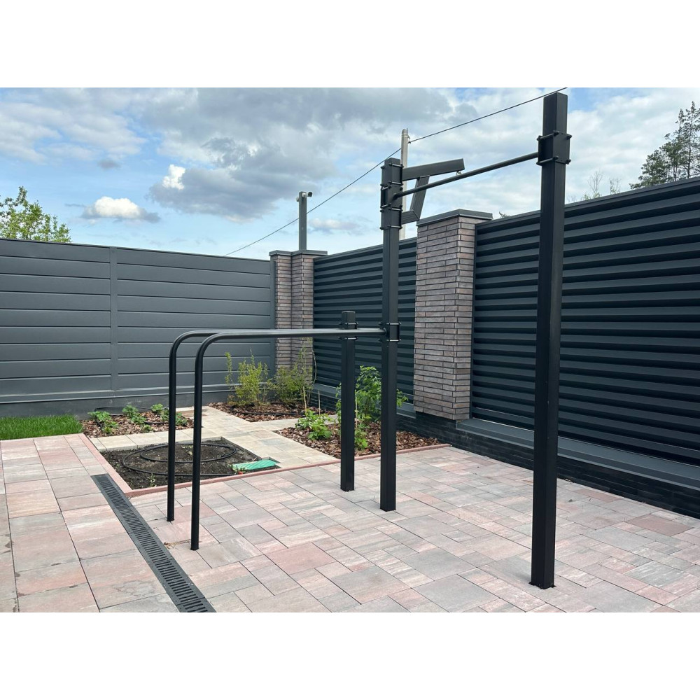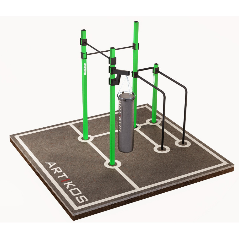 - Maksymalny zestaw: Zawiera drążek poziomy, drążki równoległe, wiązania gruszkowe, linę, tablicę do koszykówki i kramę z mocowaniem sztangi.