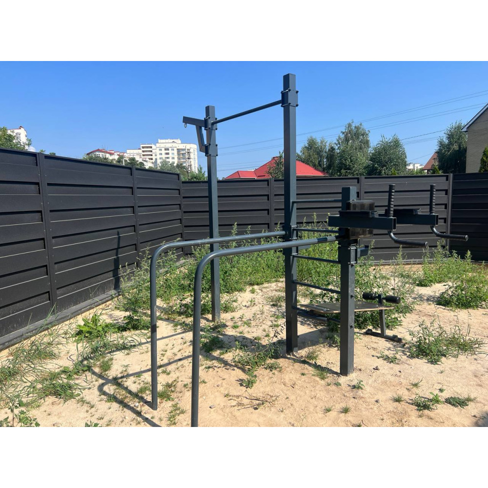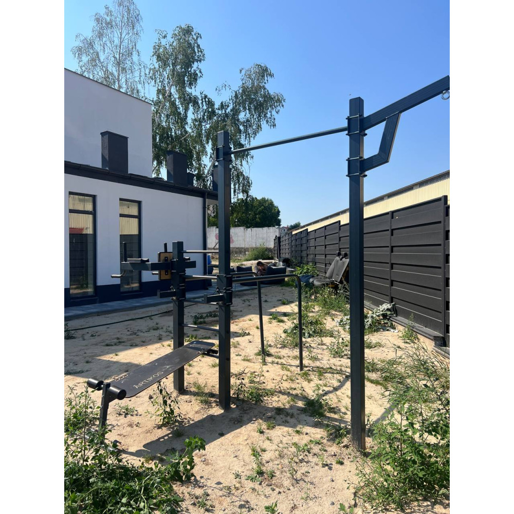 • Maksymalny zestaw: Zawiera drążek poziomy, drążki równoległe, wiązania gruszkowe, linę, tablicę do koszykówki i kramę z mocowaniem sztangi.