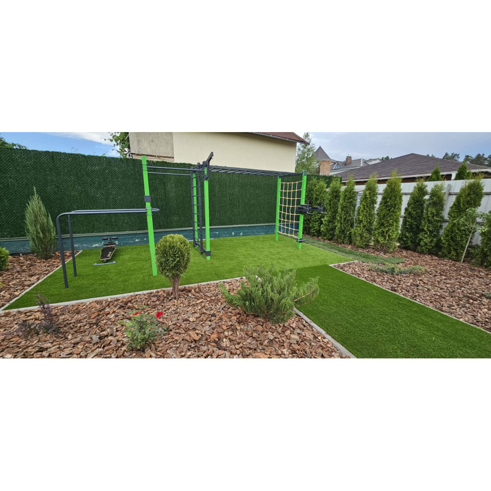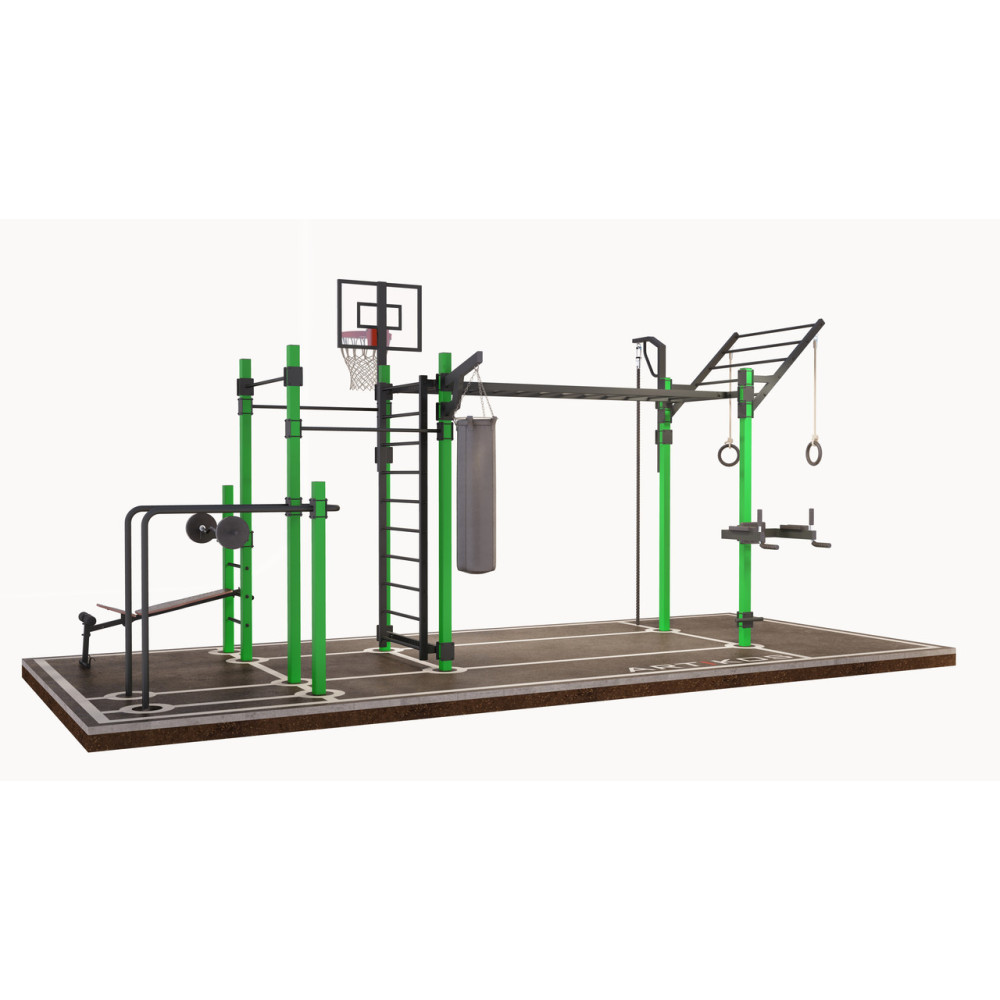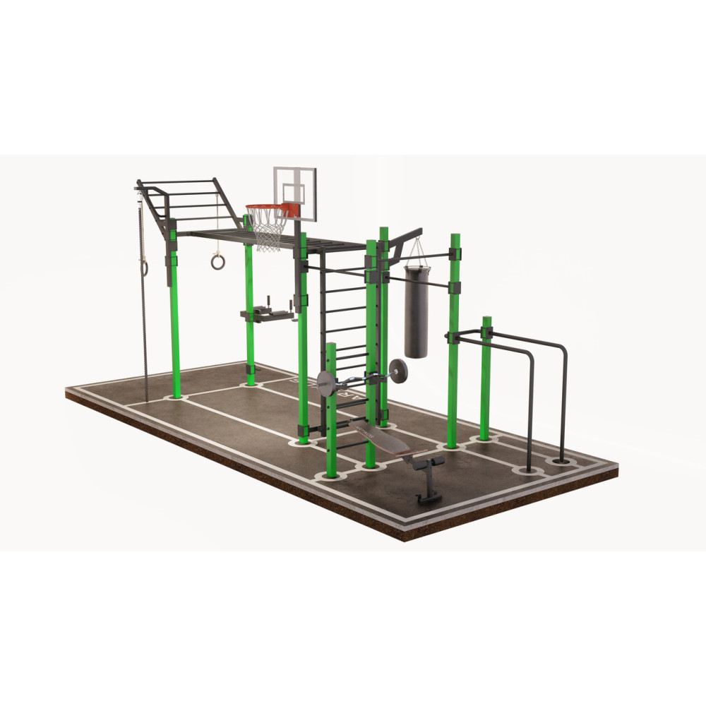 - Максимальный комплект: Включает рукоход, турник, брусья, шведскую стенку, качели, канат, баскетбольный щит, скамейку с креплением для штанги и гладиаторскую сетку.