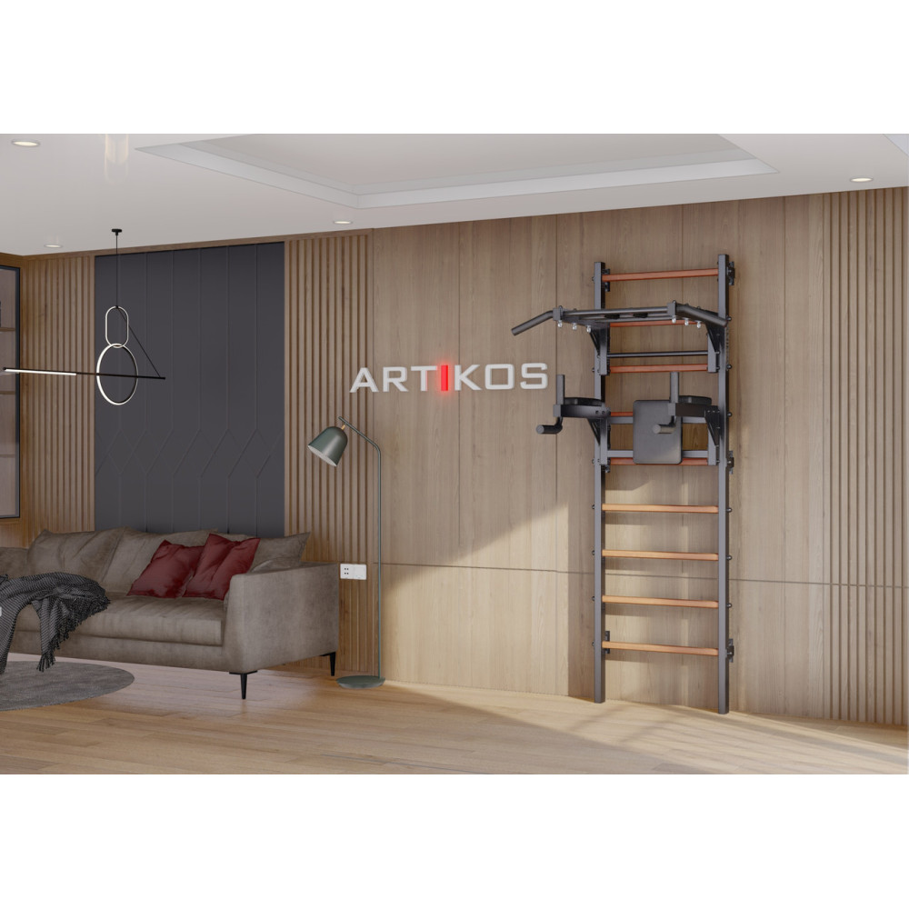 • Drabinka gimnastyczna z poziomym drążkiem i kratami to czarny Artikos PREMIUM