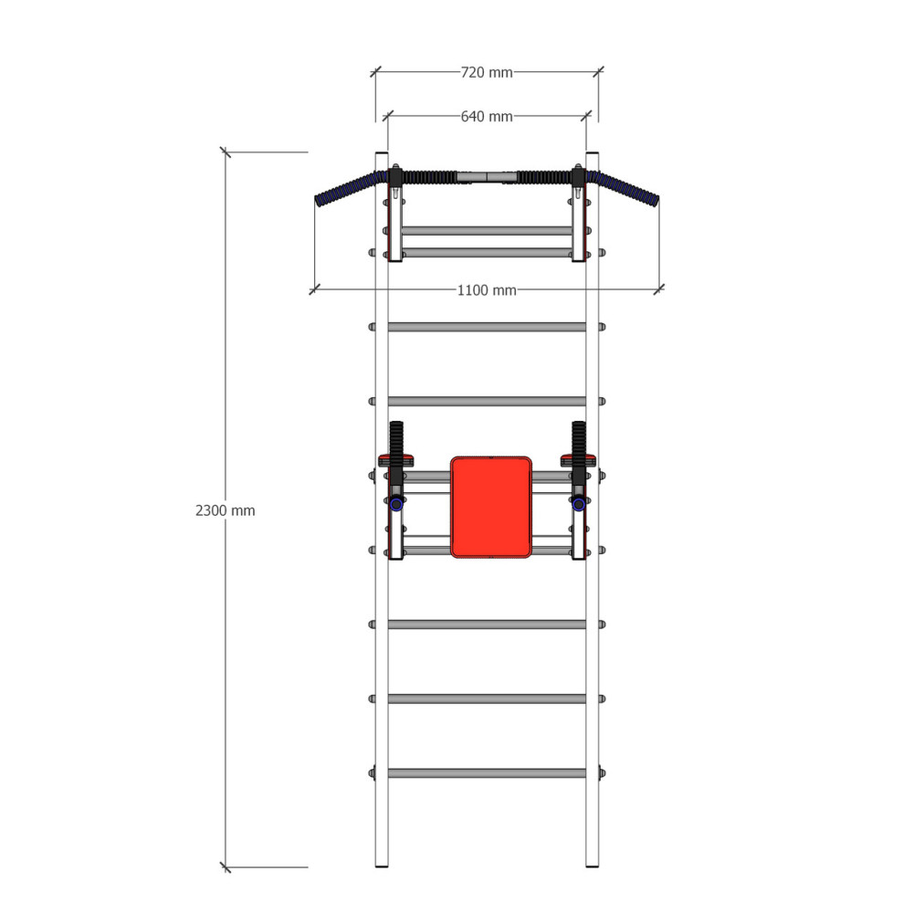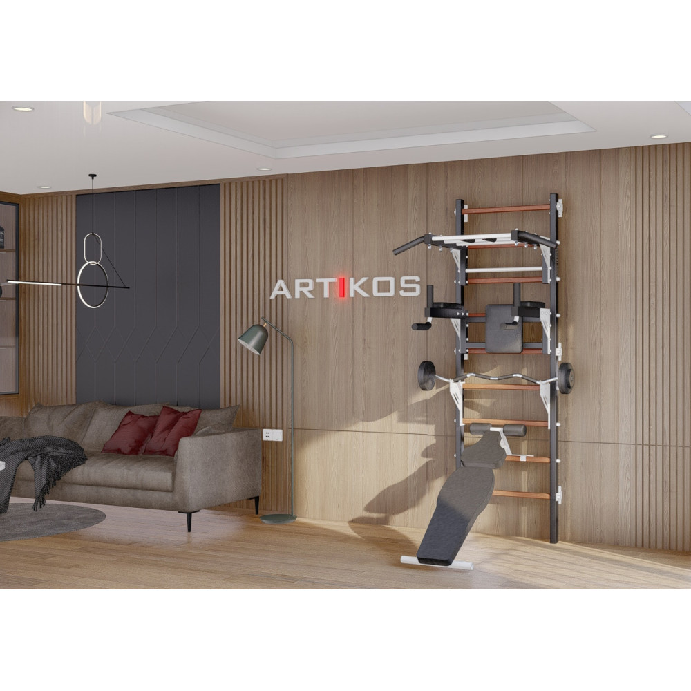 Charakterystyka techniczna Ścianka szwedzka z poziomym drążkiem, drążkami, ławeczką i stojakiem na sztangę czarno-biała Artikos PREMIUM