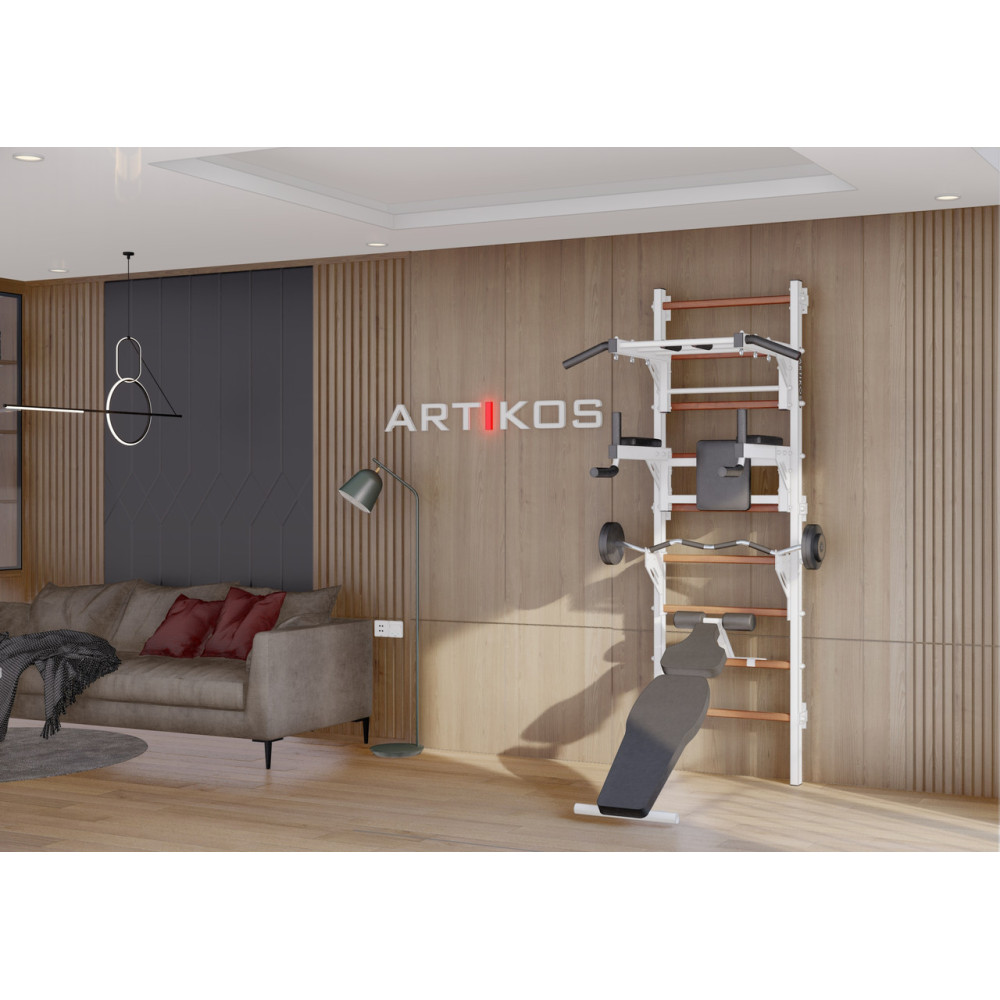 Drabinka gimnastyczna z poziomym drążkiem, drążkami, ławką i stojakiem barowym to biały Artikos PREMIUM