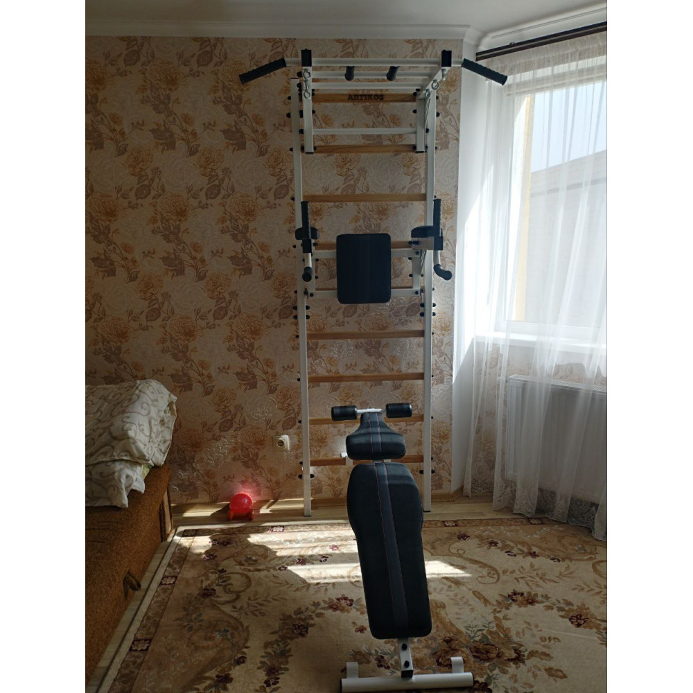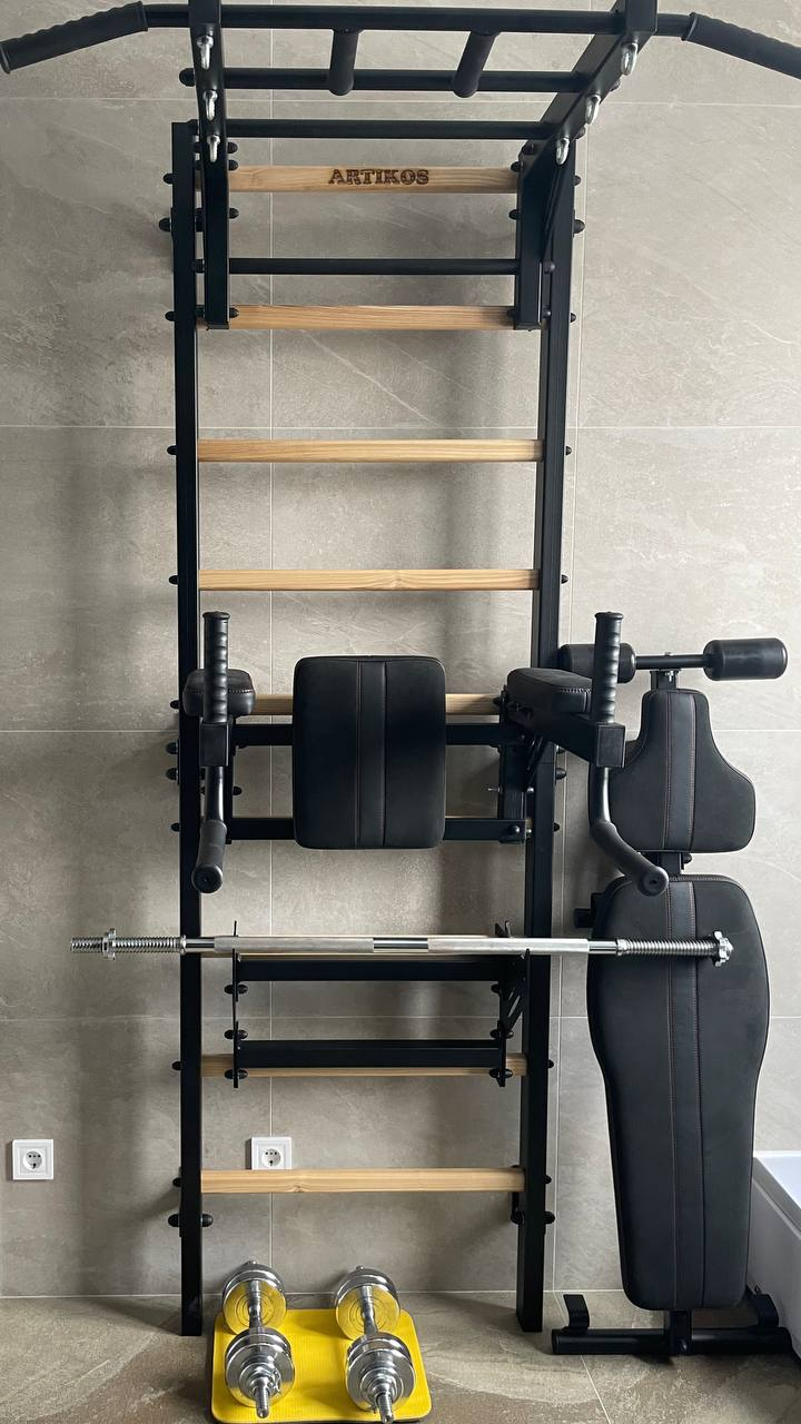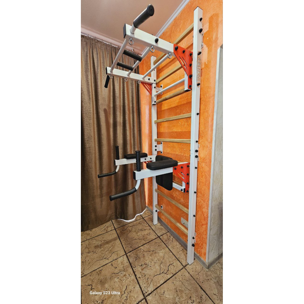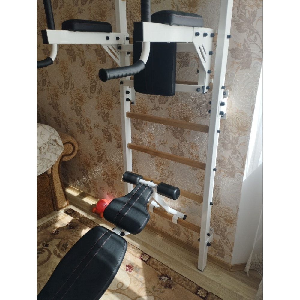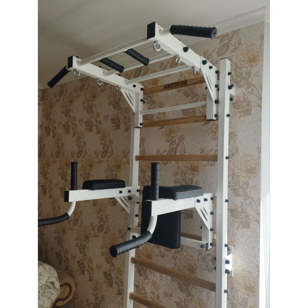 Charakterystyka techniczna Drabinka gimnastyczna z poziomym drążkiem, drążkami, ławką i stojakiem barowym to biały Artikos PREMIUM